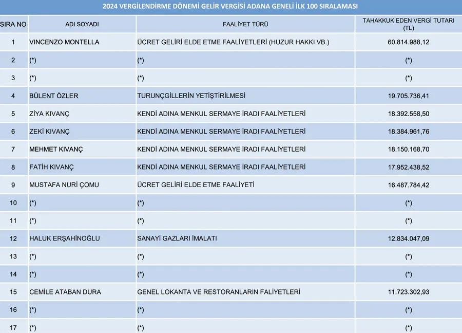 Adana'nın 2024 vergilendirme dönemi Gelir Vergisi rekortmeni, futbol camiasının yakından tanıdığı bir isim oldu. Vincenzo Montella, 60.814.988,12 TL tahakkuk eden vergi tutarıyla listenin ilk sırasında yer aldı. Montella'nın faaliyet türü, Ücret Geliri Elde Etme Faaliyetleri (Huzur Hakkı vb.) olarak belirtildi.