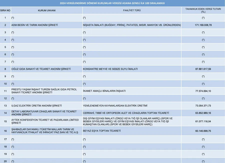 Adana Defterdarlığı, 2024 vergilendirme dönemine ait Kurumlar Vergisi ve Gelir Vergisi rekortmenlerini duyurdu. Listelerde, vergi mükellefleri tarafından ödenmesi taahhüt edilen vergi miktarları ve faaliyet türleri yer alırken, bazı mükellefler isimlerinin açıklanmasını istemedi.