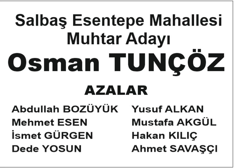 31 Mart yerel seçimleri için sandığa giden vatandaşlar, Muhtarları belirlemek için de oy kullandı. Salbaş Esentepe’de mevcut muhtar Emine Meclis tekrar kazanırken, azaları ise rakibi Osman Tunçöz’ün listesinde yer alan isimlerden oluştu. Buna göre Muhtar Meclis’in ekibinde rakip adaylar ihtiyar heyeti üyeliğine seçilerek görev almaya hak kazandı.