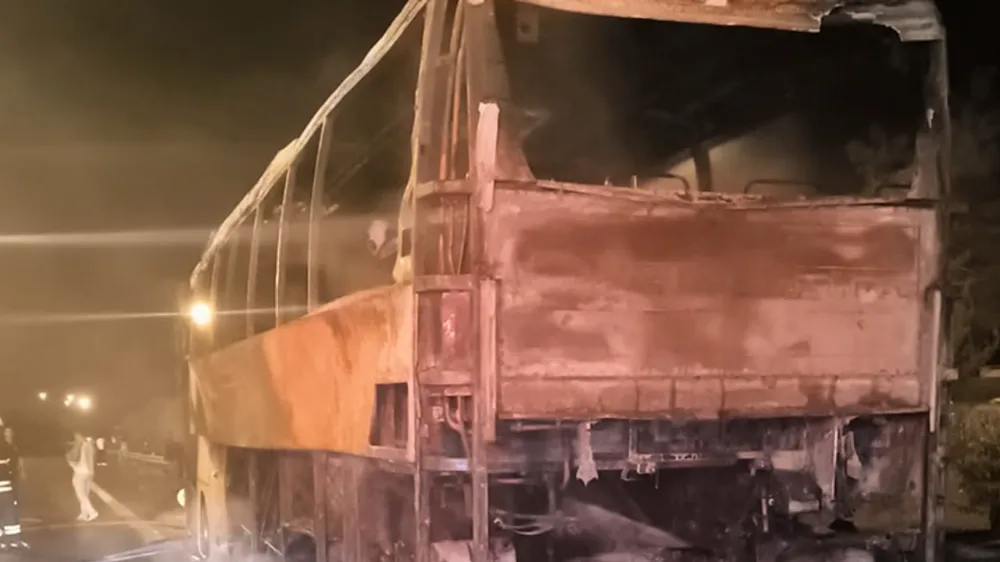 Adana'da seyir halindeyken yangın çıkan yolcu otobüsü kullanılamaz hale geldi.