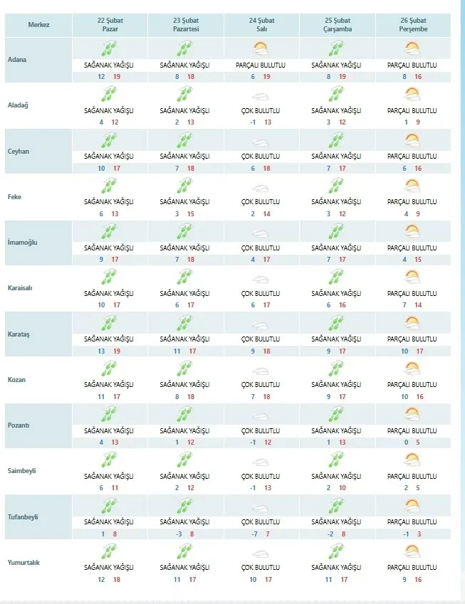 Ceyhan, İmamoğlu, Karaisalı, Karataş, Kozan ve Yumurtalık gibi ilçelerde de sağanak yağışların pazartesi ve çarşamba günleri parçalı bulutlu bir görünüme dönmesi bekleniyor. En yüksek sıcaklık değerleri Karataş’ta 18-19 derece civarında seyredecek.