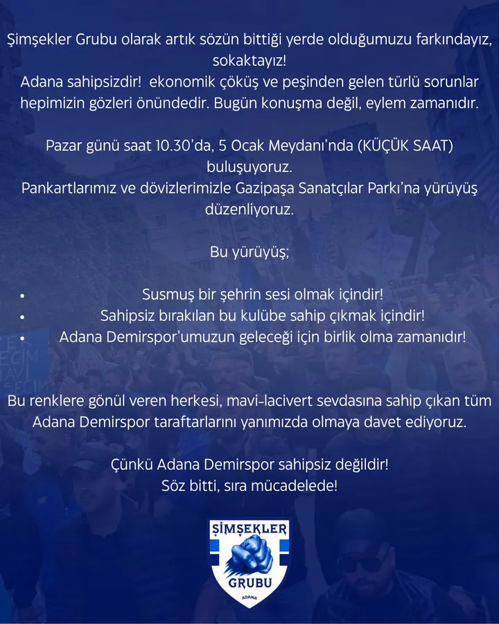 Şimşekler Grubu tarafından yapılan açıklamada, “Bu yürüyüş; susmuş bir şehrin sesi olmak, sahipsiz bırakılan bu kulübe sahip çıkmak ve Adana Demirspor’un geleceği için birlik olmak içindir. Bu renklere gönül veren herkesi yanımızda görmek istiyoruz.” denildi.